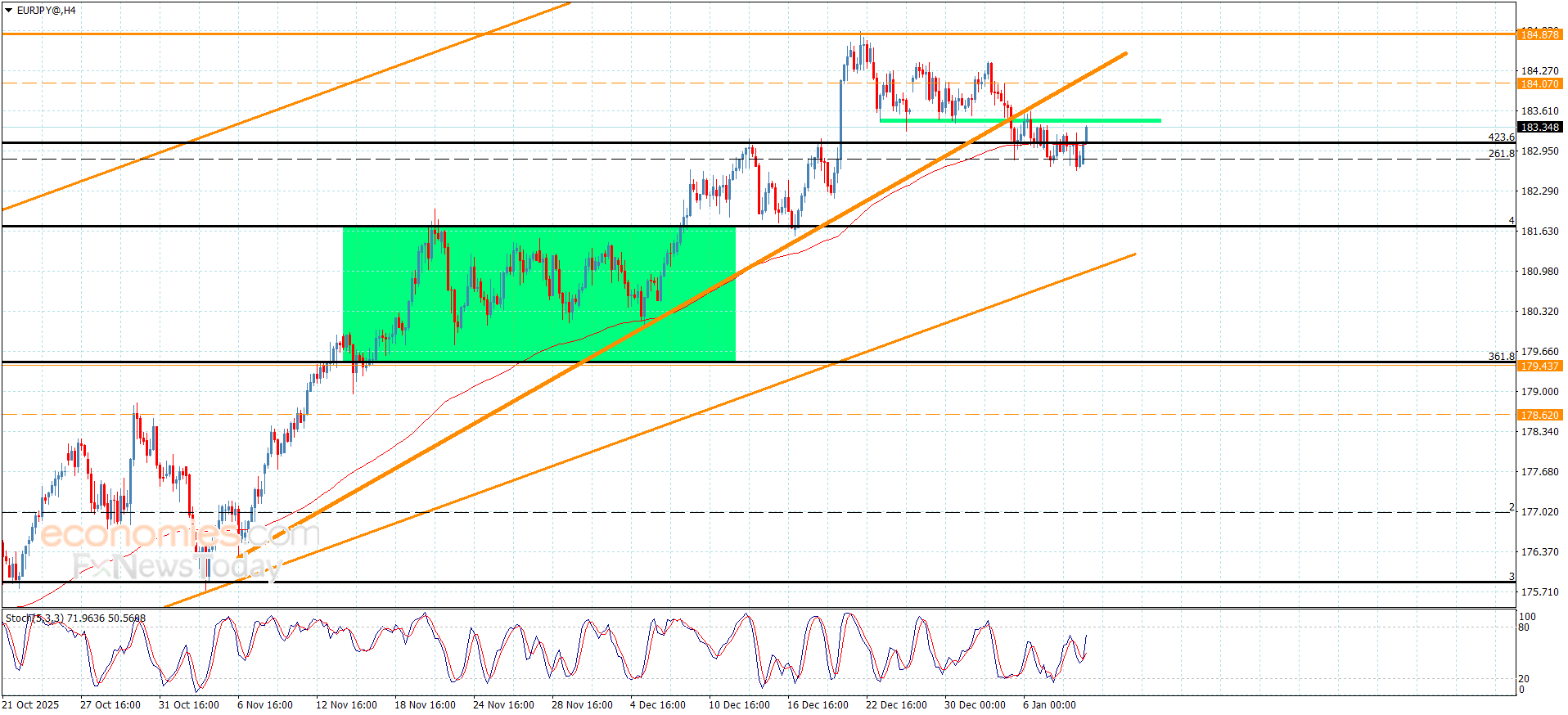 The EURJPY pair succeeded in holding above 182.80 support, taking advantage of providing extra positive momentum by stochastic, to attack the barrier at 183.50 to find an exit for renewing the bullish attempts, waiting to achieve the breach and providing a positive close above it, to confirm targeting the positive stations near 183.85 and 184.15.
