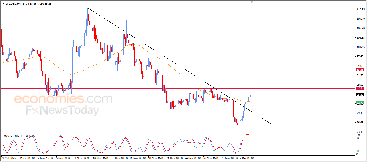 Litecoin (LTCUSD) continued rising in its latest intraday trading, supported by dynamic strength from trading above its 50-day SMA and by the earlier breakout of a main short-term descending trendline, which pushes the price toward further gains in the coming period. However, we also note the arrival of negative signals from the RSI indicators after reaching extremely overbought levels, which may limit the cryptocurrency’s upward movement ahead.