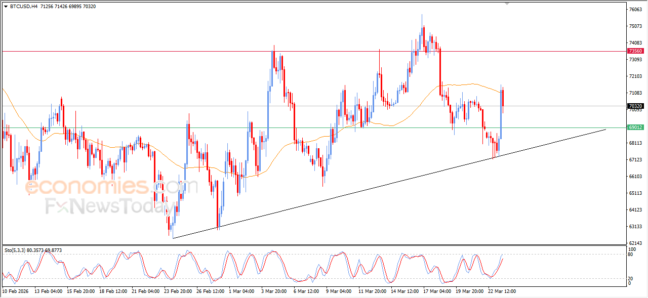 The (BTCUSD) price declined in its last intraday trading, after reaching the resistance of EMA50, to gather the gains of its rises, attempting to gain bullish momentum that might help it to get rid of the negative pressure, after drawing the line of the bullish trend, with the emergence of the positive signals from the relative strength indicators, after reaching oversold levels.