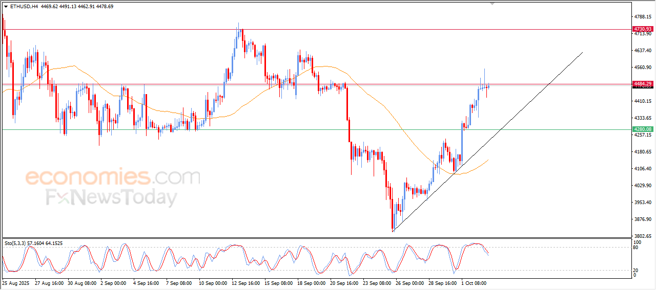 The price of (ETHUSD) witnessed fluctuated trading on its last intraday levels, amid the attempts of breaching the current resistance at $4,500, accompanied by its attempt to offload its overbought conditions on the relative strength indicators, especially with the emergence of the negative signals from them, amid the dominance of steep bullish corrective waves, indicating the strength and the dominance of the positive track.