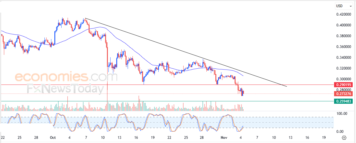 Therefore, we expect the cryptocurrency to decline in its upcoming intraday trading as long as the resistance level of $0.290195 holds, targeting the next support level at $0.259483.