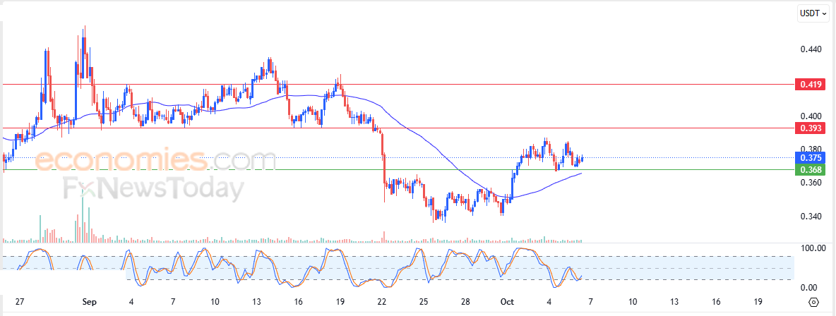 Therefore, we expect the cryptocurrency to rise in upcoming trading sessions, provided that support holds at 0.368, to target the key resistance level of 0.393.