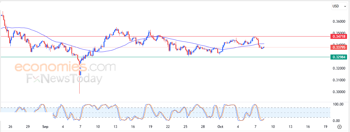 Therefore, we expect the cryptocurrency to decline in upcoming trading sessions, as long as resistance holds at 0.34718, targeting the key support level of 0.32984.