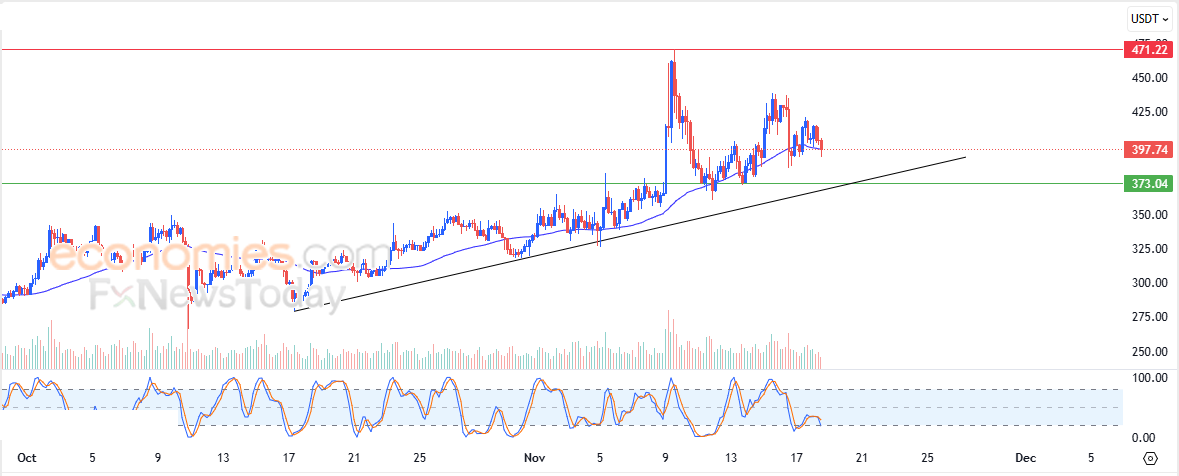 Therefore, our expectations lean toward a rise in the coin’s price during the upcoming intraday sessions, as long as support at 373.00 holds, targeting the key resistance level at 471.00.