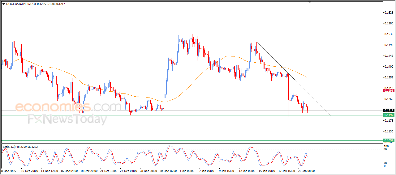Therefore we expect the cryptocurrency price to decline in upcoming intraday trading, especially if it breaks below the $0.1200 support level, to target the next support at $0.1095.