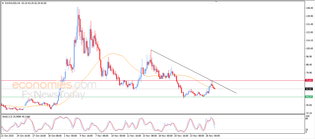 Dash (DASHUSD) declined in its latest intraday trading, under the dominance of the main short-term descending trend, with the price moving alongside a secondary trendline supporting this bearish structure. Negative signals continue to appear on the RSI indicators after they reached extremely overbought levels, and in its recent movement the price broke below its 50-day SMA, which further intensifies the surrounding negative pressure.