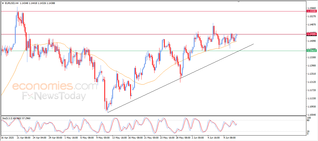 The price of (EURUSD) rose in its recent intraday levels, attacking the critical resistance level at 1.1440, taking advantage of the dynamic support that is represented by its trading above EMA50, and under the domination of the bullish correctional trend and its trading alongside a bias line, this rise came after the price success to offload its clear overbought condition on the (RSI), which make the positive signals return again, reinforcing the positive scenario.