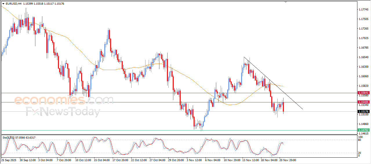 The price of (EURUSD) slipped lower in its last intraday trading, due to the stability of the resistance at 1.1540, amid the dominance of the main bearish trend and the trading alongside minor trend line on the short-term basis, with the beginning of forming negative divergence on the relative strength indicators, after reaching exaggerated overbought levels compared to the price move, with the emergence of the negative signals from there.