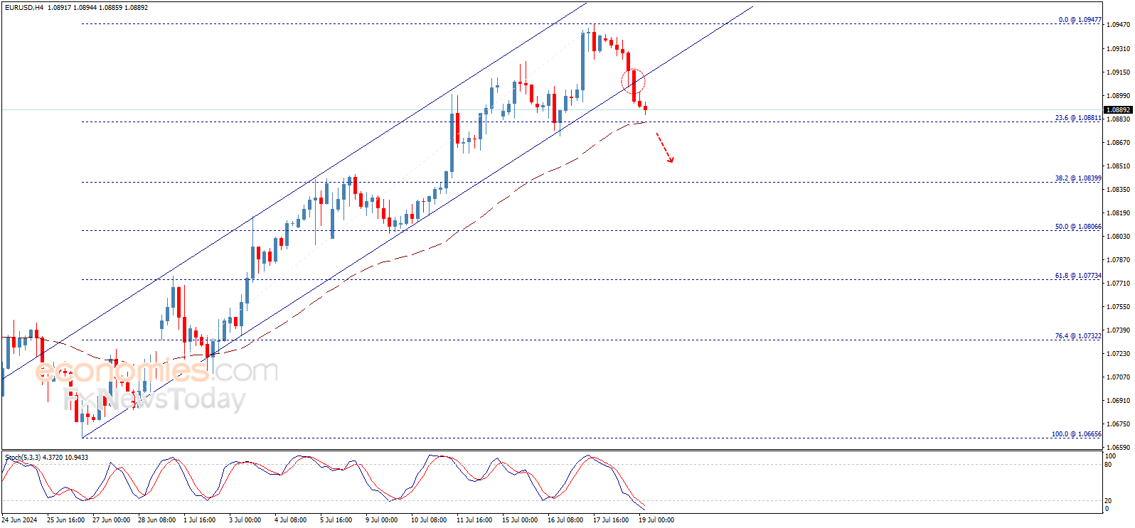 The EURUSD price confirmed breaking the bullish channel’s support line after ending yesterday below it, to head towards achieving bearish correction for the rise measured from 1.0665$ to 1.0947$, noting that breaking 1.0880$ will push the price towards 1.0840$ followed by 1.0775$ as next negative stations.