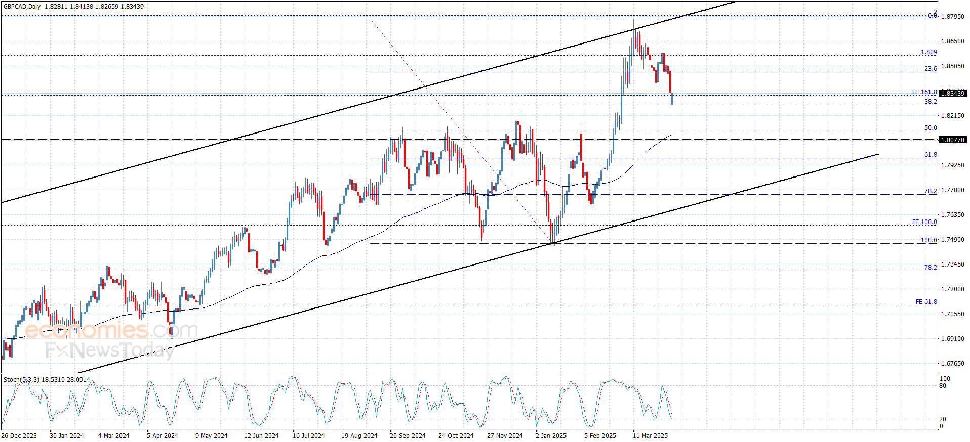 CADGBP pair’s price began activating the bearish correctional attack by its repeated stability below the bullish channel’s resistance at 1,8770, besides providing negative momentum by stochastic, to notice suffering losses by reaching 38.2% Fibonacci correction level at 1.827.