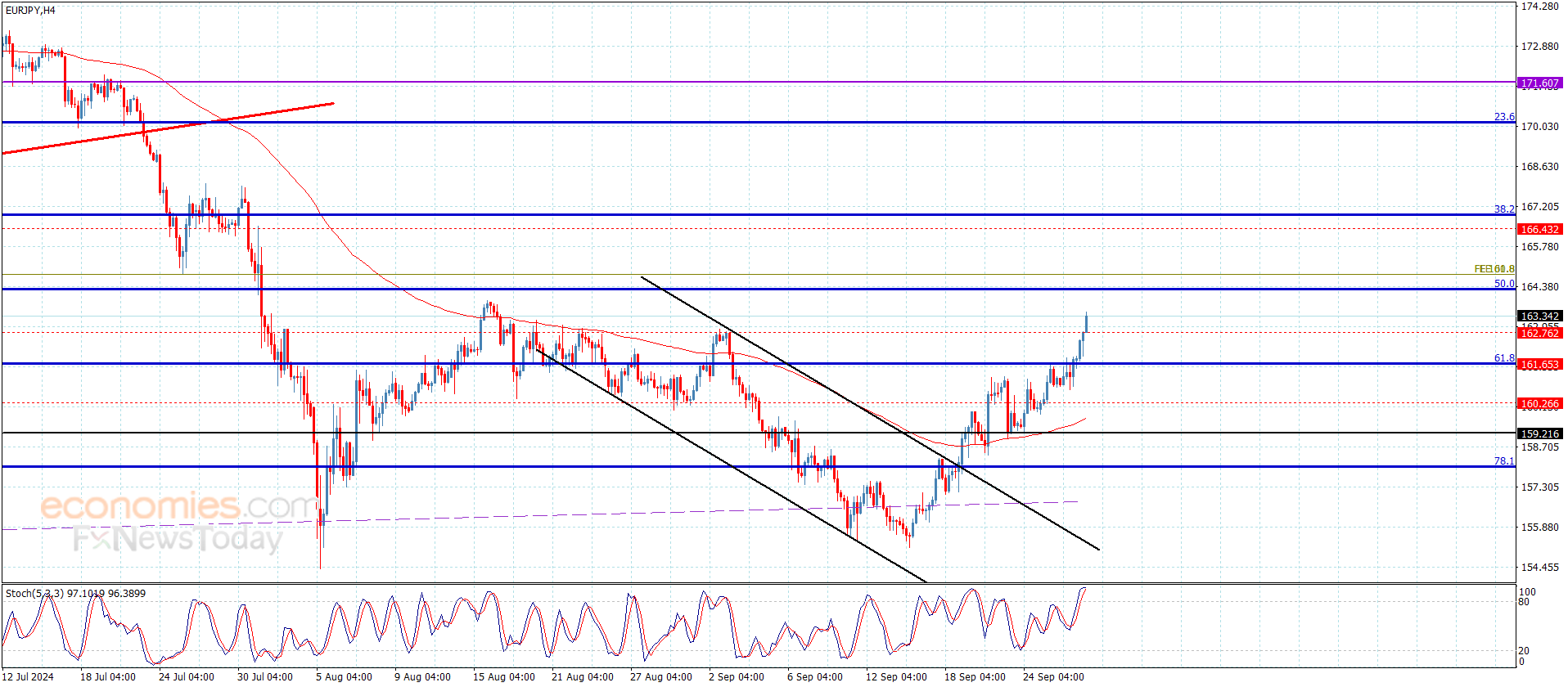 The EURJPY pair confirmed keeping the bullish track by breaching 161.60 barrier to open the way to record big gains by reaching 163.45, also, stochastic consolidates within the overbought areas to allow us to suggest more bullish attempts that might target 164.25 level soon, to form the next main target of the current trades.