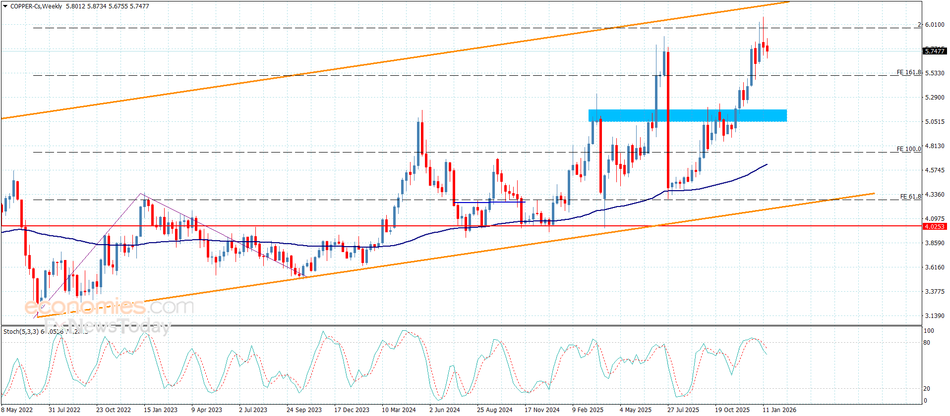Copper price approached the initial corrective target yesterday at $5.6500, to confirm delaying the attempts to resume the bullish trend due to its stability at $5.9700, besides providing negative momentum by its continued leaning below 80 level as appears in the above image.