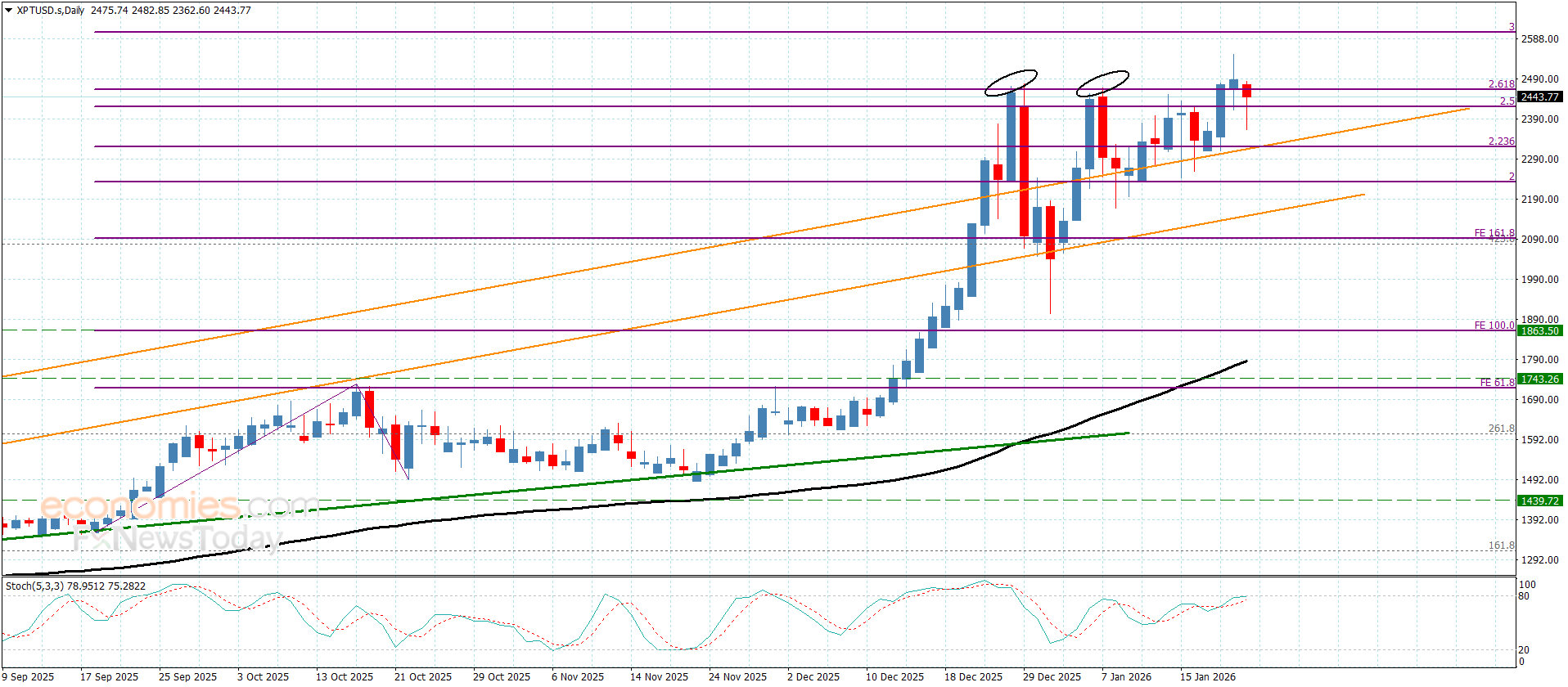 Platinum price lost the bullish momentum yesterday, which forces it to provide mixed trading after achieving the waited target by reaching $2550.00 level, to end the stability above the extra support level at $2320.00, confirming the stability of the bullish scenario.