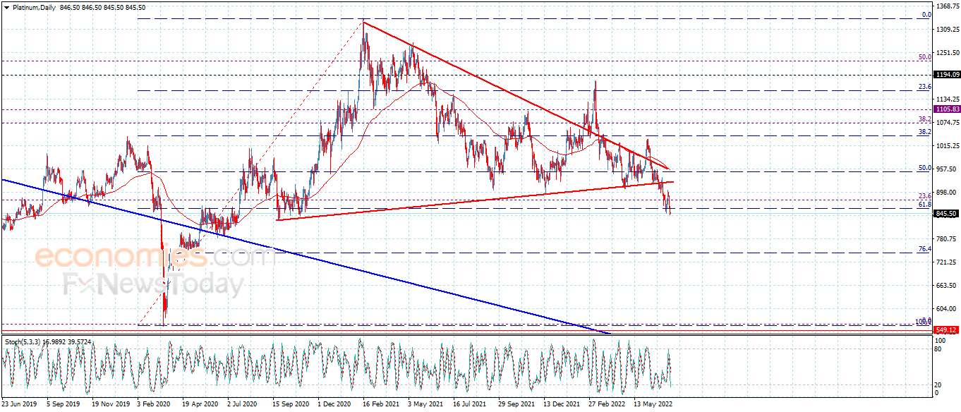 Platinum price confirmed surrendering to the domination of the bearish bias by providing new negative close below 855.00, which increases the efficiency of the negative attack, for the near term and medium term period, expecting to reach 805.00 and 780.00 levels.