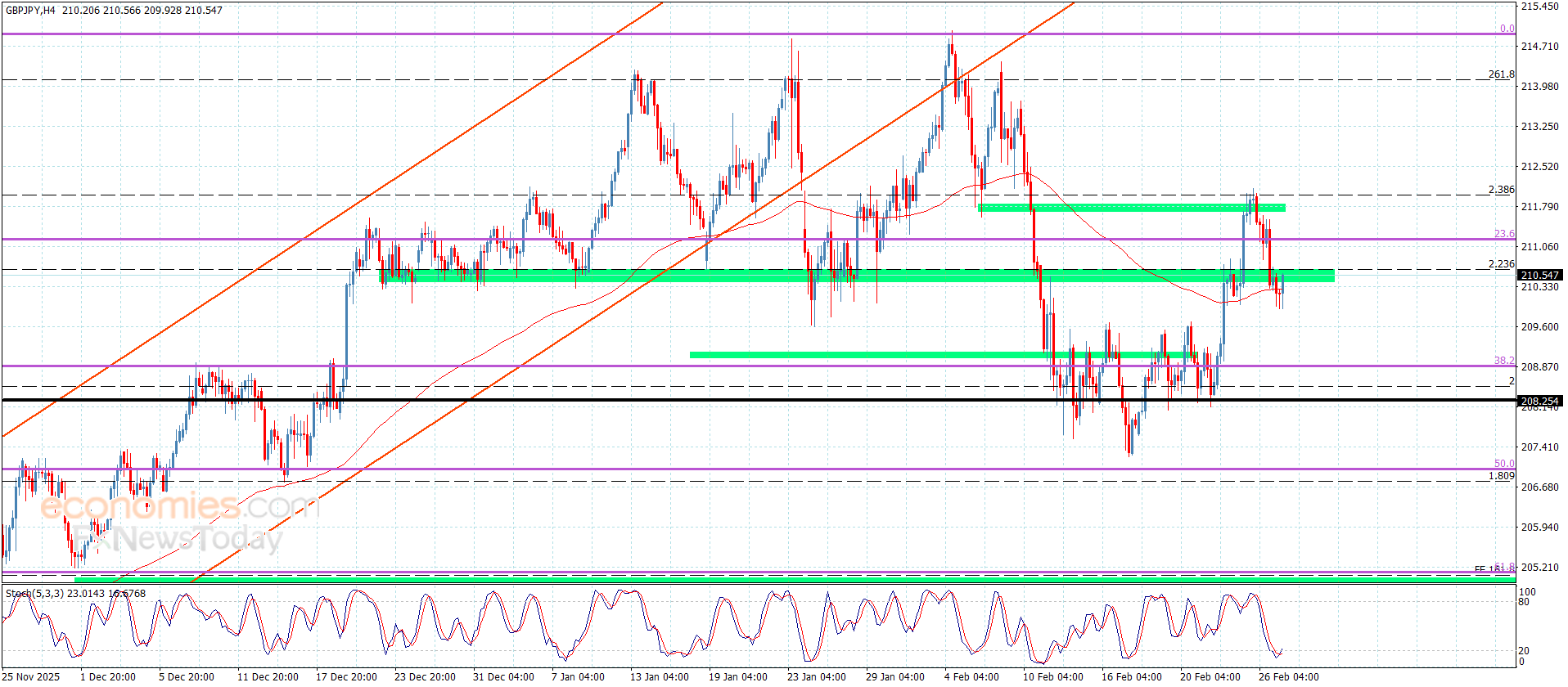 The GBPJPY pair kept its negative stability below the barrier at 212.10 level, forming strong bearish waves, to settle below 210.65 level, forming initial target in the previous report, to confirm its readiness to resume the bearish attack by its stability near 210.00.