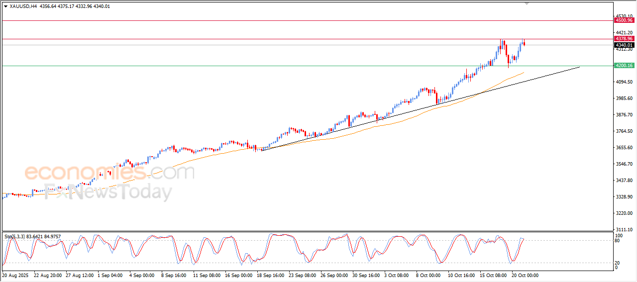 The (Gold) price declined slightly in its last intraday trading, affected by the stability of the key resistance at $4,378, which represents our expected target in our previous analysis, the price attempts to gain some bullish momentum to help it breach this resistance and resume recording new all-time highs in the near-term basis.
