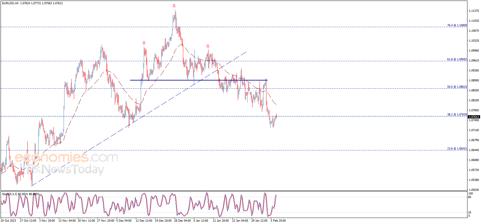 The EURUSD pair fluctuates around 1.0765 level and continues the attempts to breach, to keep our bullish overview that requires confirmed breach to this level to rally towards 1.0805 followed by 1.0860 levels as next positive stations, noting that stochastic negativity hinders the mission to rise.