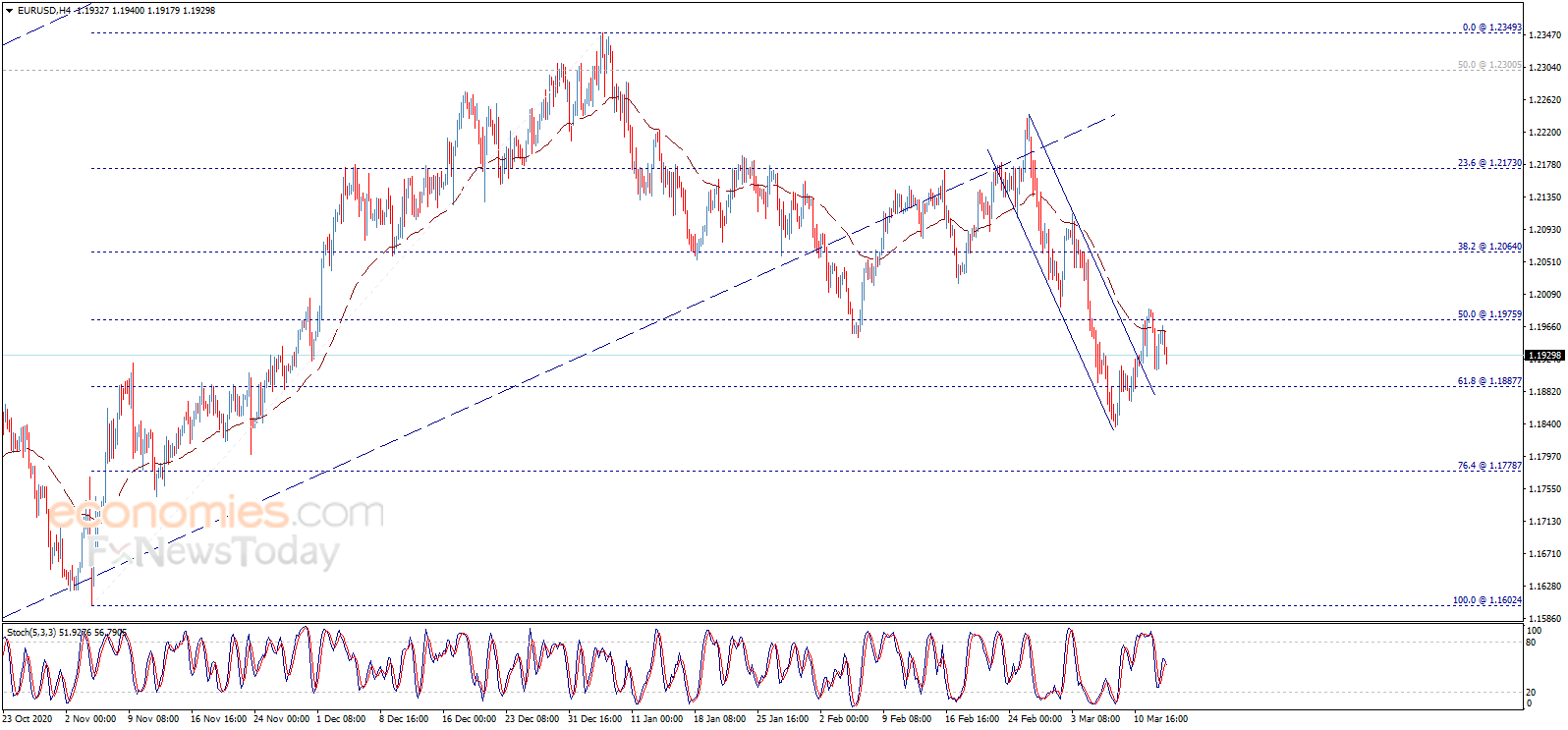 The EURUSD pair bounced bearishly after touching the EMA50 this morning, which support the expectations of continuing the bearish trend for the upcoming sessions, which targets 1.1888 followed by 1.1780 after breaking the previous level, reminding you that the continuation of the bearish wave depends on the price stability below 1.1976.
