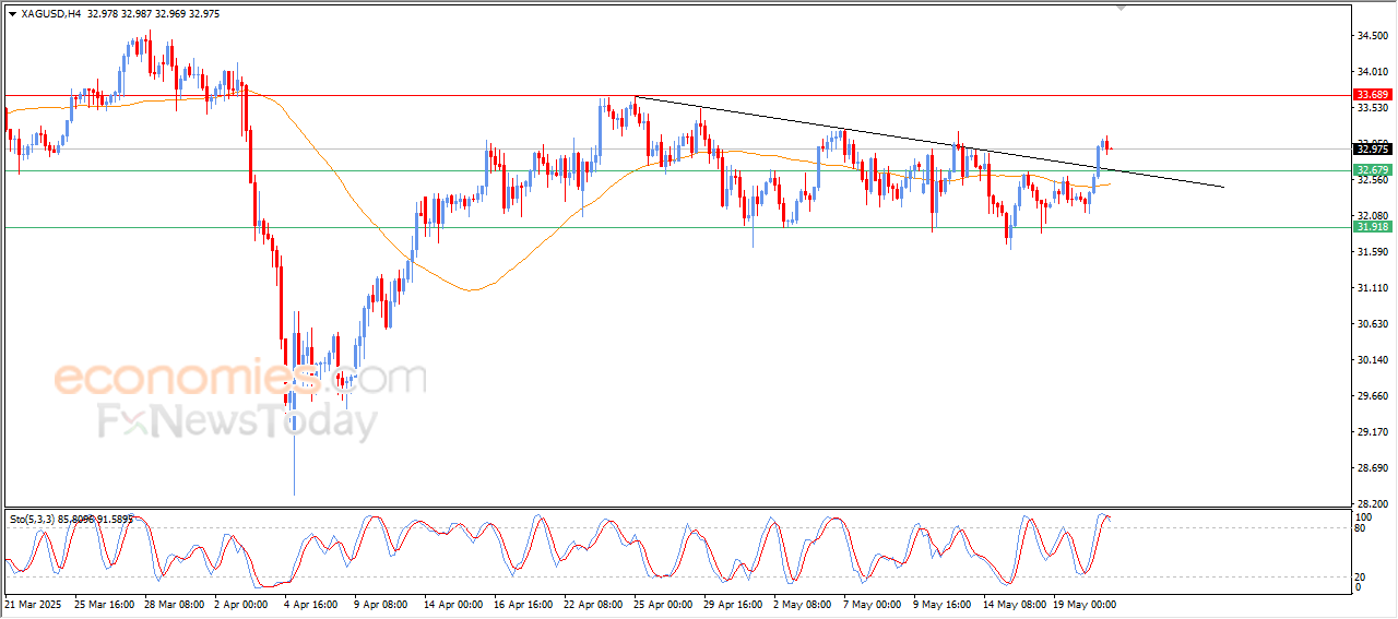 The (silver) price declined slightly in its last intraday trading, to gather the gains of its last rises, and attempts to gain positive momentum that might assist it to recover and rise again, and it attempts to offload some of its clear overbought conditions on the (RSI), especially with the appearance of negative overlapping signals, amid its affection by breaching a minor bearish bias line on the short-term basis, with the continuation of the positive support that comes from its trading above its EMA50.