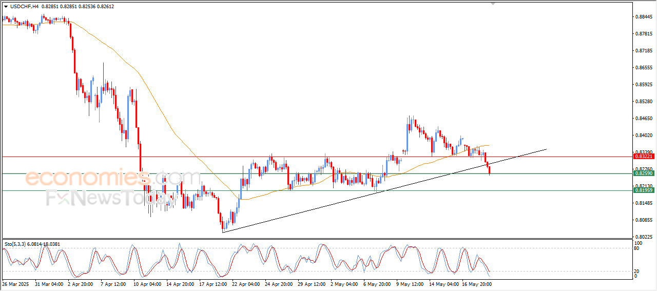 The (USDCHF) price continued the decline its last intraday trading, by a continuous negative pressure due to its trading below its EMA50, to break a bullish correctional trend line on the short-term basis, which increases the negative pressures around the pair, especially with the emergence of the negative signals on the (RSI), despite reaching oversold levels.