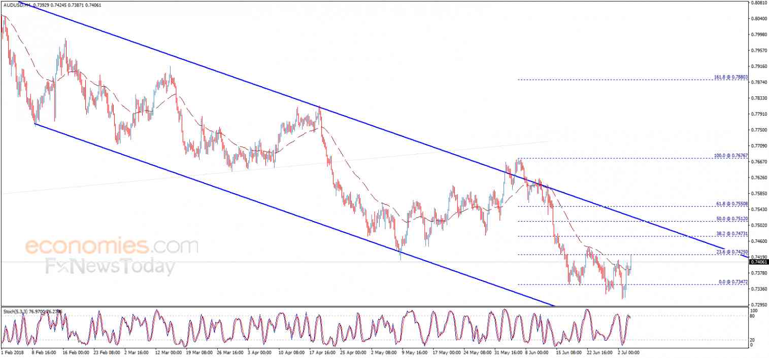 The AUDUSD pair tested 0.7425 level and still below it until now, noticing that stochastic shows overbought signals now, which supports the expectations of continuing the bearish trend in the upcoming sessions, which targets 0.7270 level as a first station, noting that breaching 0.7425 will push the price to test 0.7510 areas before any new attempt to decline.