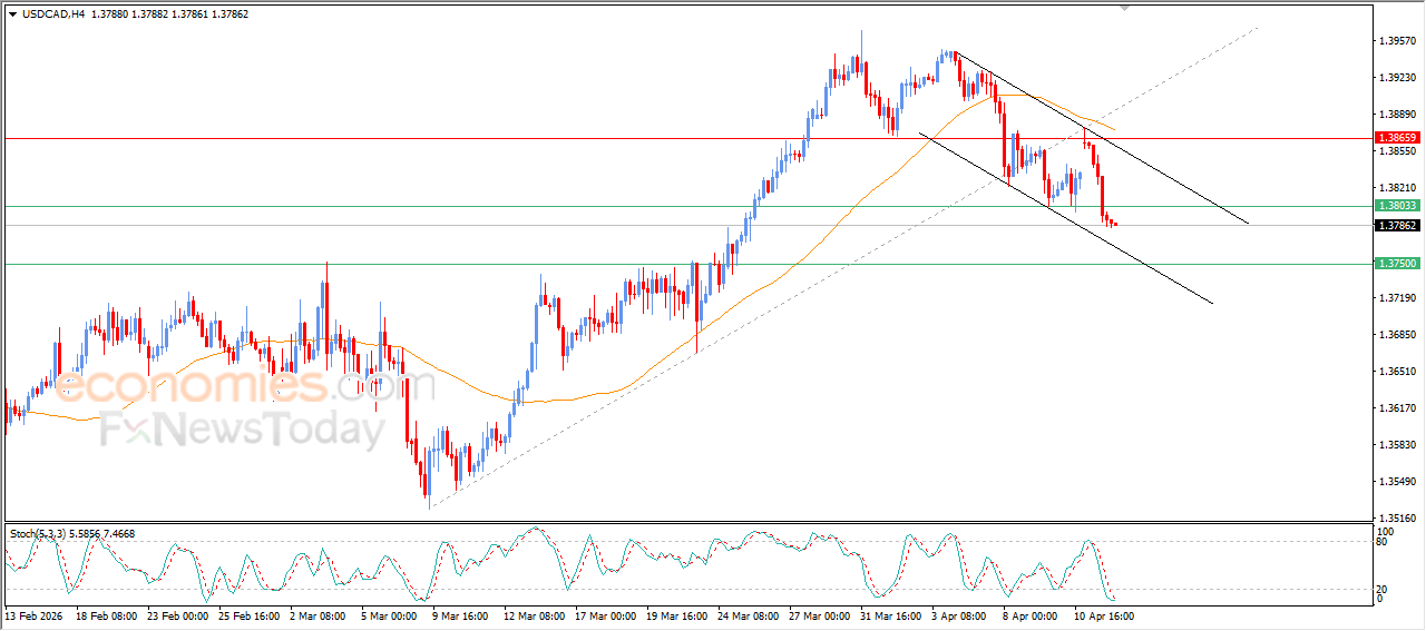 The USDCAD pair continued to move lower during its latest intraday trading, successfully breaking below the key support level at 1.3800, which had been a projected target in our previous analyses. This move comes amid the dominance of a short-term corrective bearish wave, with price action trading within a downward price channel.