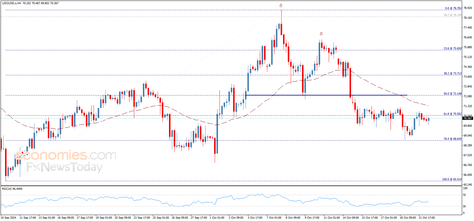 Crude oil price shows sideways and tight trades since morning, thus, no change to the expected bearish trend scenario for today, which depends on the price stability below 70.58$, affected by the previously completed double top pattern, reminding you that our next target is located at 68.65$.