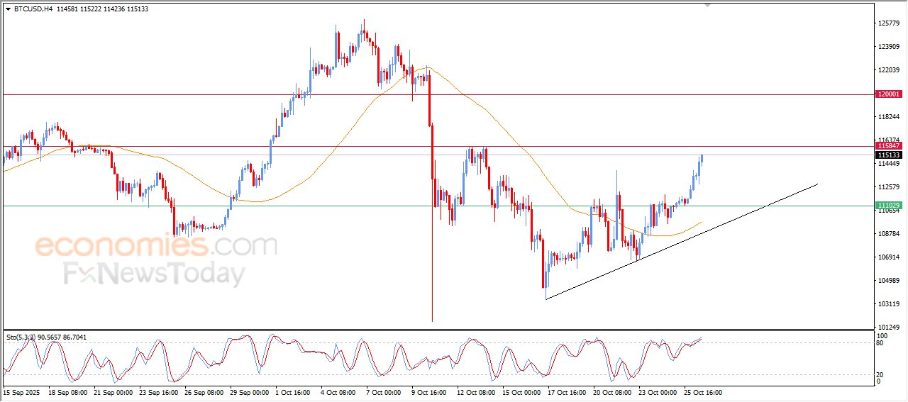 Bitcoin (BTCUSD) price continued its rise in its last intraday trading, approaching from testing the resistance level at $115,800, which represents our expected target in our previous analysis, this rise comes amid the continuation of the bullish corrective trend on the short-term basis, where the price moves alongside supportive trendline that confirms the strength of the dominant bullish momentum in the market.