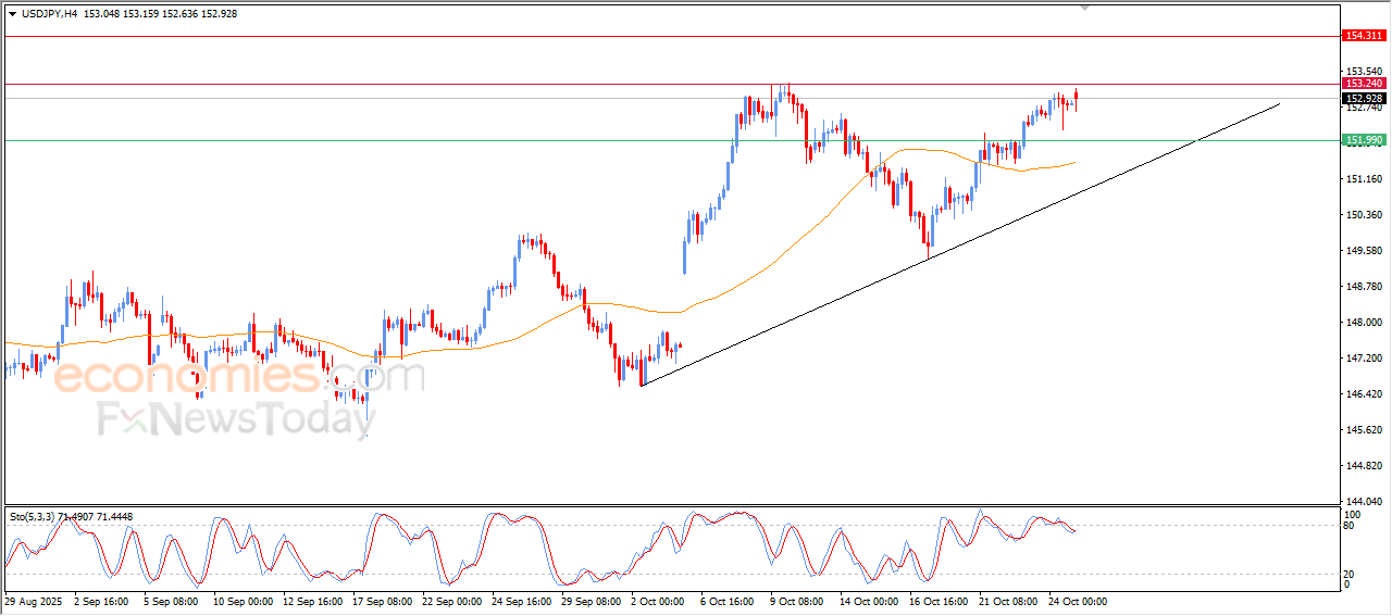 The (USDJPY) rose in its last intraday trading, preparing to attack the key resistance level at 153.25, amid the continuation of the positive pressure that comes from its trading above EMA50, and under the dominance of the main bullish trend and its trading alongside minor trendline that reinforces the stability of this track, besides offloading its overbought conditions on the relative strength indicators, opening the way for testing new resistance levels in the upcoming period.