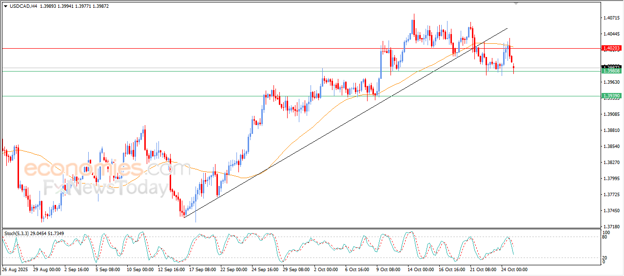 The (USDCAD) price continued the decline in its last intraday trading, after reaching the resistance of EMA50, which puts it under intensified negative pressure amid the dominance of bearish corrective wave on the short-term basis, affected by breaking main bullish trend line, preparing to break the key support level at 1.3980, especially with the emergence of the negative signals on the relative strength indicators, after reaching overbought levels previously.
