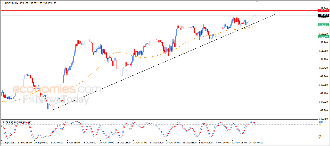 The (USDJPY) kept rising in its last intraday trading, taking advantage of the dominance of the main bullish trend on the short-term basis, with its trading alongside supportive trend line, besides the continuation of the dynamic support that is represented by its trading above EMA50, which reinforced the stability of the bullish movement in the last period, on the other hand, we notice the beginning of negative signals appearance on the relative strength indicators, after reaching overbought levels, which might reduce the gains in the upcoming period.