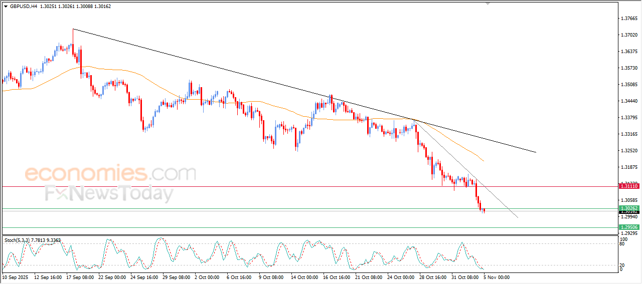 The (GBPUSD) price kept declining in its last intraday trading, to break 1.3030 support, which represents our expected target in our previous analysis, amid the dominance of the main bearish trend on the short-term basis and its trading alongside main and minor trend lines, which indicates the volume and strength of the bearish momentum, especially with the emergence of the negative signals on the relative strength indicators, despite reaching oversold levels.