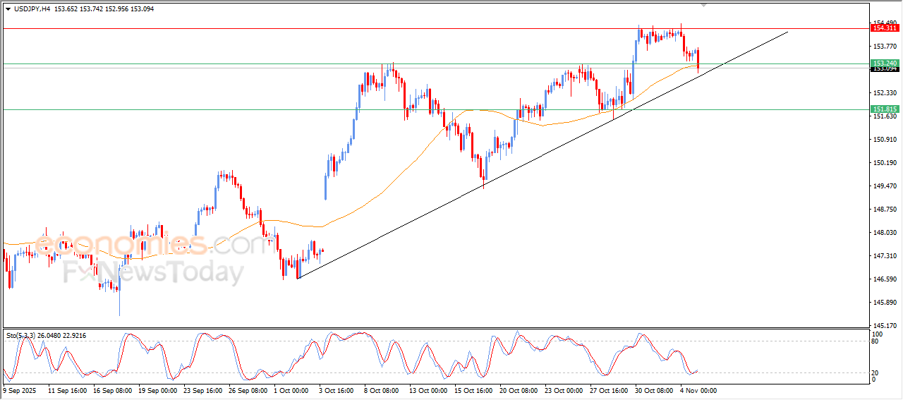 The (USDJPY) slipped lower during its last intraday trading, due to the stability of the key resistance at 154.30, attempting to look for rising low to help it gain the required positive momentum to recover, the price is leaning on the support of its EMA50, accompanied by testing main bullish trend line on the short-term basis, as a lst chance for gaining this bullish momentum, supported by the beginning of forming positive divergence on the relative strength indicators, after reaching exaggerated oversold levels, with the emergence of the positive signals.