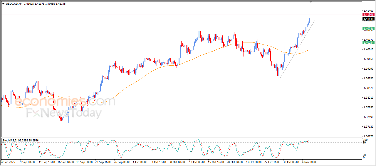 The (USDCAD) price continues the rise in its last intraday trading, after breaching the key resistance of 1.4075, which was our expected target in our previous analysis, amid the dominance of the main bullish trend on the short-term basis, and its trading above EMA50, reinforcing the stability of this bullish track, besides the emergence of the positive signals on the relative strength indicators, despite reaching overbought levels.