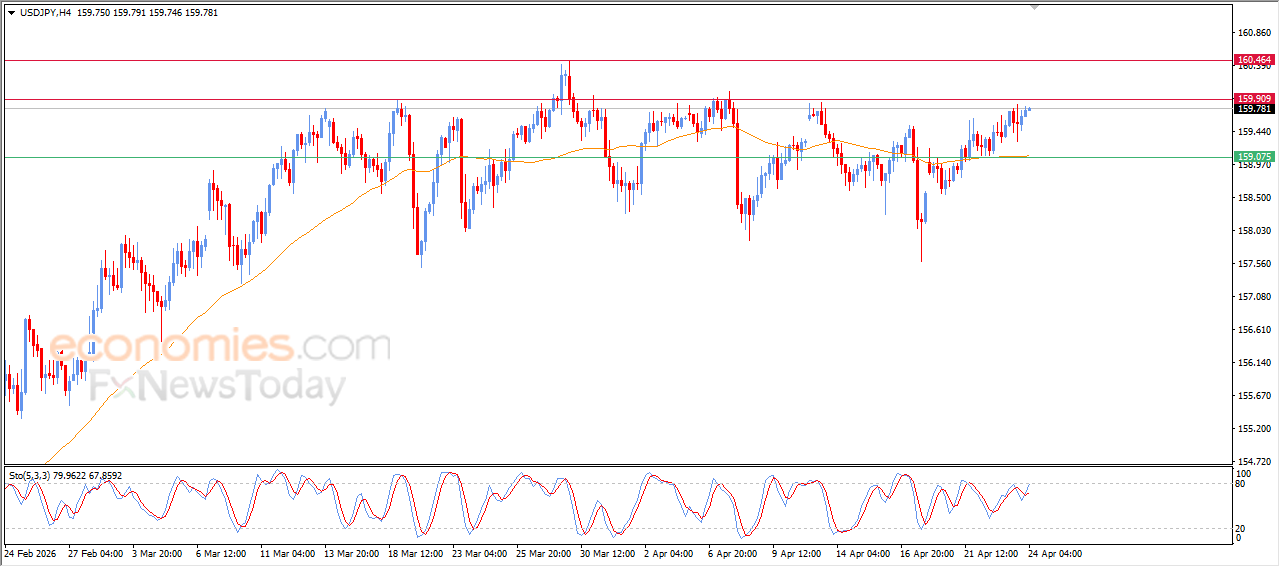 The USDJPY pair extended its gains during recent intraday trading and is now preparing to challenge the key resistance level at 159.90. This comes as the pair continues to receive dynamic support from trading above its EMA50, reinforcing the stability and dominance of the main short-term bullish trend.