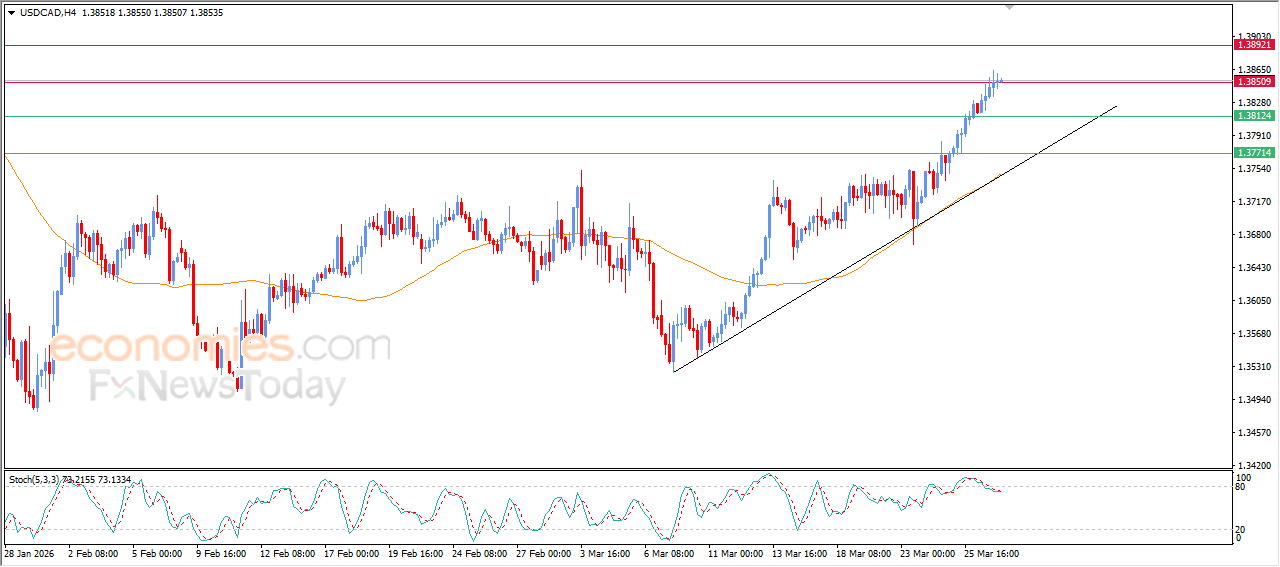 The USDCAD pair has maintained its gains in recent intraday trading, reaching the resistance level at 1.3850, which had been a target in our previous analysis. The pair is now attempting to build positive momentum to sustain the main short-term bullish trend.