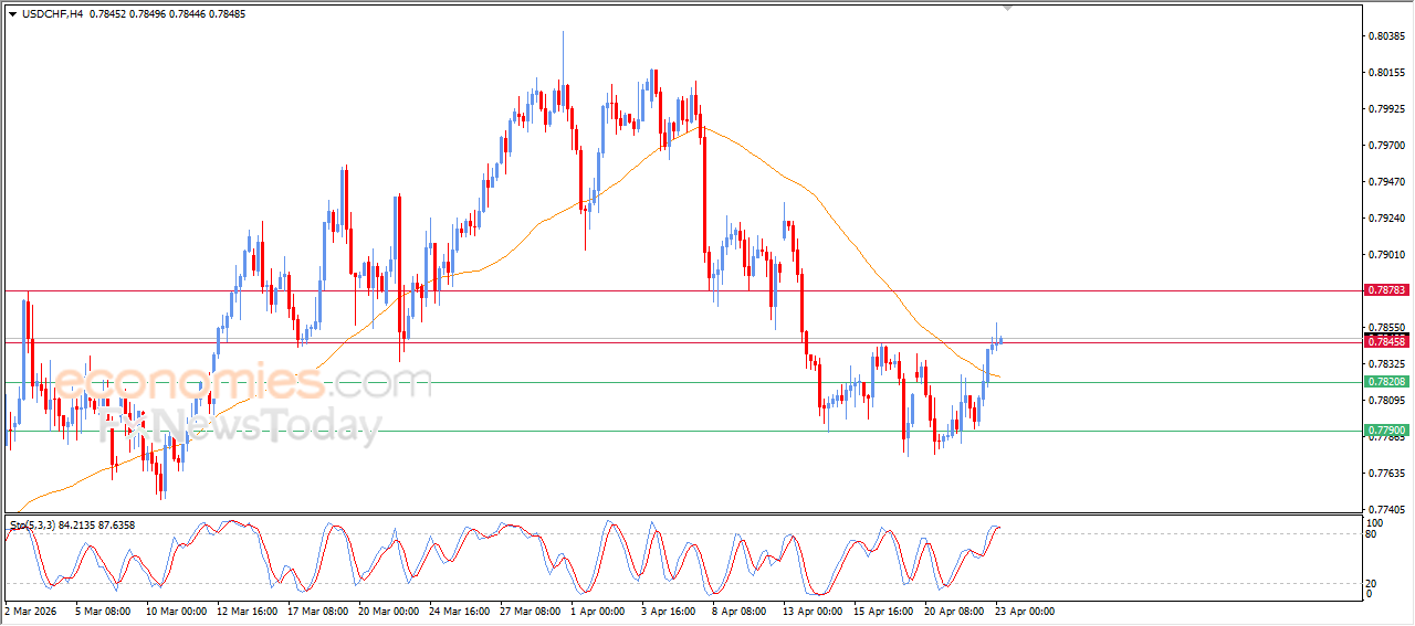 USDCHF continued its upward movement in recent intraday trading after managing to overcome the negative pressure from EMA50. The pair is now testing the key resistance level at 0.7845.