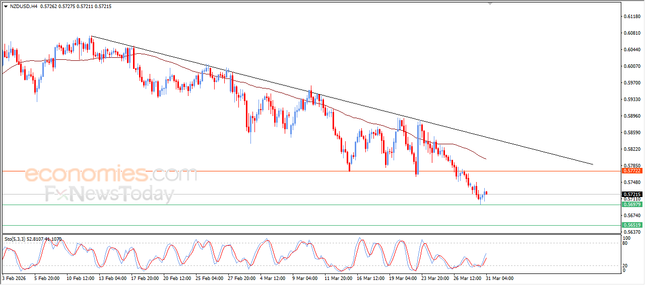 The NZDUSD pair rose during recent intraday trading, supported by positive signals from the relative strength indicators after reaching deeply oversold levels. The pair also benefited from the firmness of the 0.5700 support level, which had previously been identified as a price target, allowing it to recover part of its earlier losses.