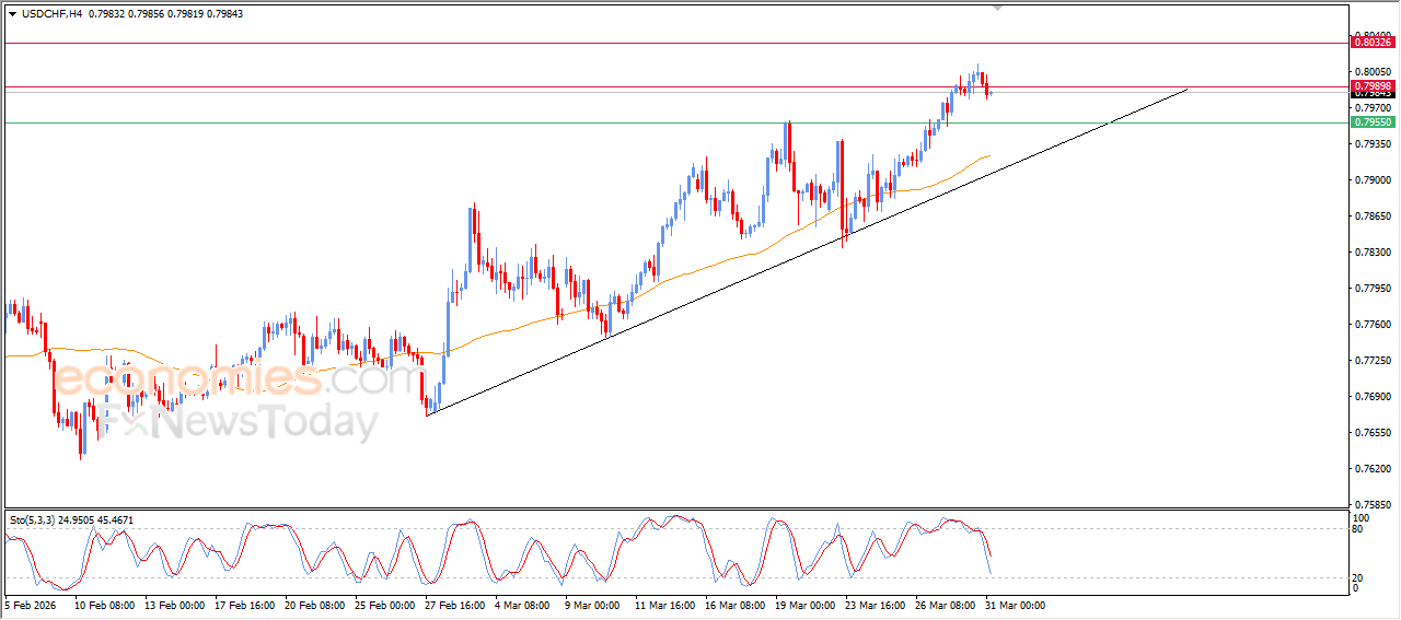 The USDCHF pair declined slightly during recent intraday trading, affected by the firmness of the 0.7990 resistance level. The relative strength indicators moved from previously overbought levels into deeply oversold territory relative to price action, signaling a potential buildup of positive momentum that could help the pair break above this resistance.