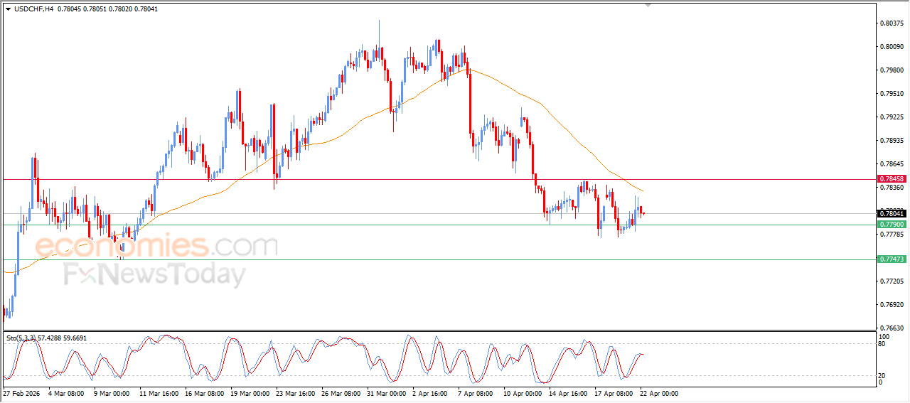 The USDCHF pair declined during its recent intraday trading, as it is currently preparing to break the key support level at 0.7790. This comes amid the dominance of a short-term bearish corrective trend, with continued negative pressure due to trading below its EMA50, which limits the chances of a full recovery in the near term.