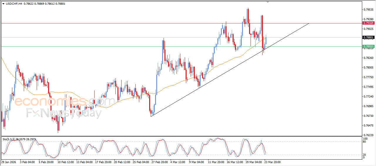 Accordingly, our expectations lean toward a rise in USDCHF in upcoming intraday trading, if the support level at 0.7855 holds, targeting the first resistance level at 0.7920.
