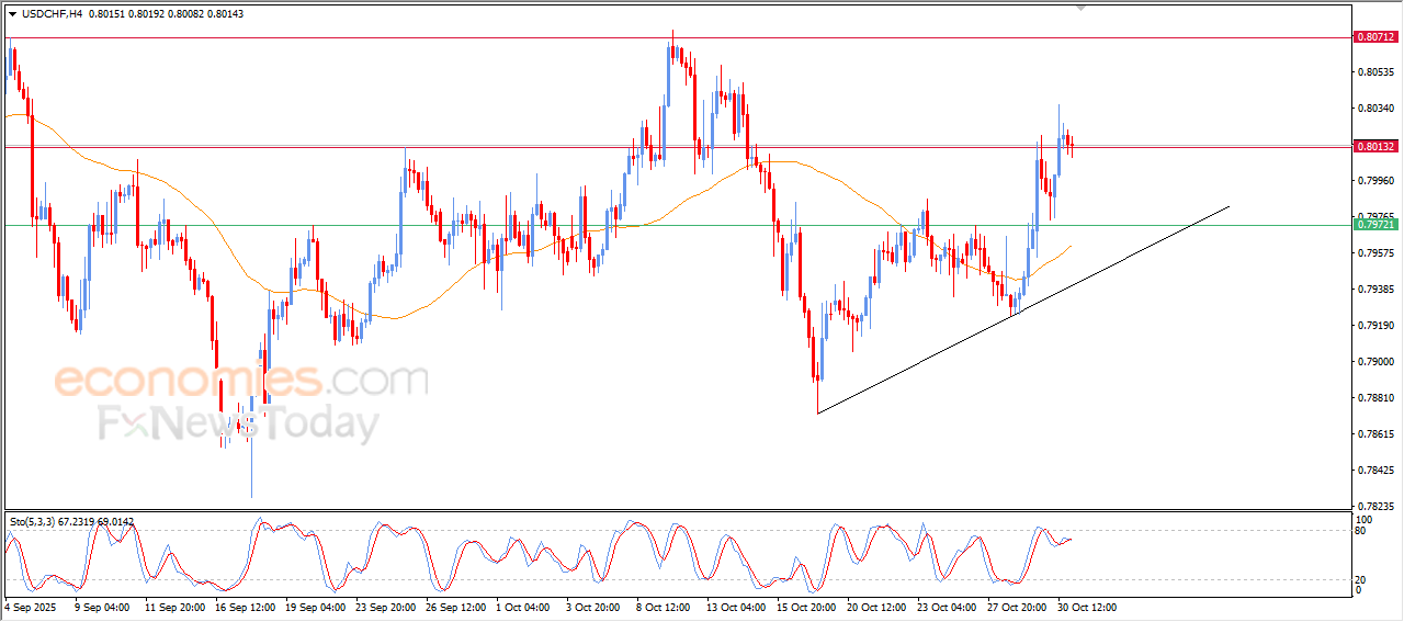 The (USDCHF) price declined in its last intraday trading, due to the stability of the stubborn resistance at 0.8010, attempting to gain the required bullish momentum to breach this resistance, amid the continuation of the dynamic pressure that is represented by its trading above EMA50, and under the dominance of minor bullish wave on the short-term basis and its trading alongside supportive trendline for this track, besides the emergence of the bullish signals on the relative strength indicators after offloading its overbought conditions, opening the way for achieving more gains on the near-term basis.