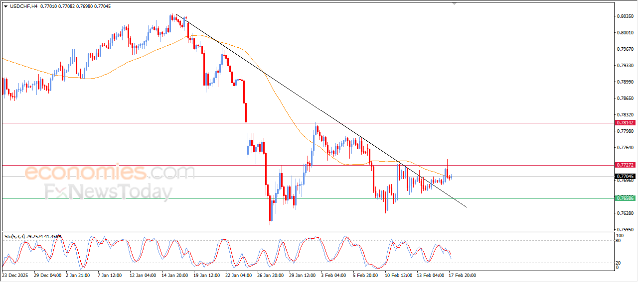 The (USDCHF) price settles on losses in its last intraday trading, with the stability of the key resistance at 0.7725, with the emergence of negative signals from relative strength indicators, reaching EMA50’s support, in attempt to gain bullish momentum that might help it to breach this resistance and detect the upcoming track in the upcoming period, affected by breaching main bearish trend line on short-term basis.