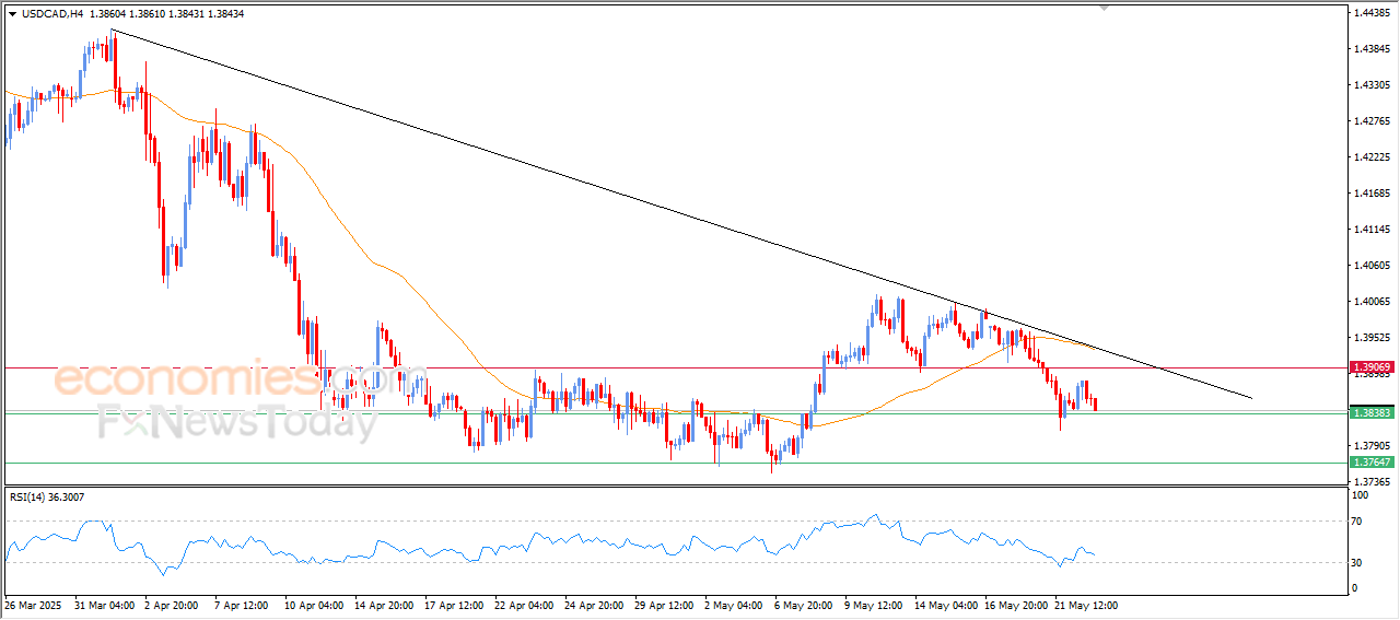 The (USDCAD) price declined in its last intraday trading, getting ready to break the current support at 1.3840, amid the dominance of the main bearish trend and its trading alongside a bias line, with the continuation of the negative pressure due to its trading below its EMA50, besides the emergence of the negative signals on the (RSI), after the price success in offloading its oversold conditions in the previous trading.