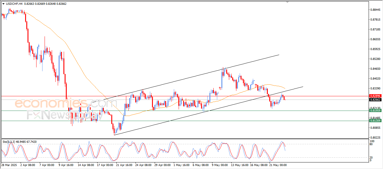 The (USDCHF) price declined in its last intraday trading, due to the stability of the key resistance level at 0.8290, amid the continuation of the negative pressure that comes from its trading below EMA50, with the formation of a negative divergence on the (RSI), after reaching exaggerated overbought levels compared by the price current move, with the beginning of the negative signal emergence, this comes amid its affection by getting out of a bullish correctional channel's range that was limiting its previous trading on the short-term basis.