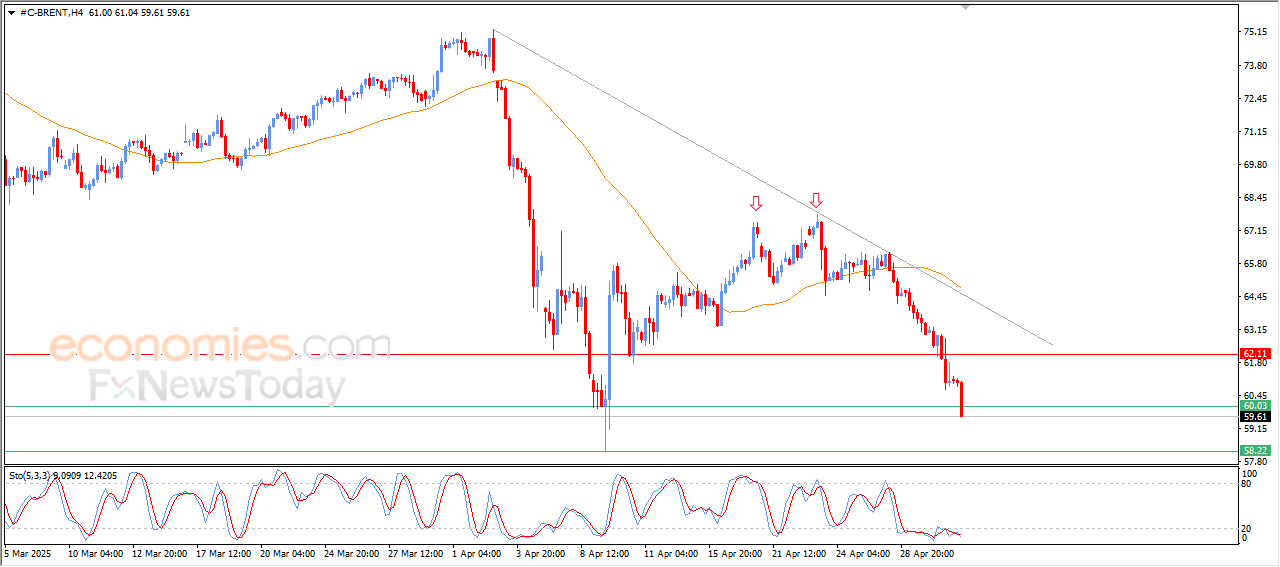 Brent crude oil suffered a sharp decline in its last intraday trading, to break our morning target at $60.00, under the main bearish trend on the short-term basis and its trading alongside bias line, and there aren’t any positive motives.