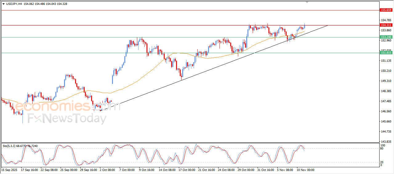 The (USDJPY) rose in its last intraday trading, attacking the stubborn and key resistance at 154.30, which was our expected target in our previous analysis, supported by its trading above EMA50, and under the dominance of the main bullish trend on the short-term basis and its trading alongside supportive trendline for this track, the last rise came despite the emergence of negative signals on the relative strength indicators, after reaching overbought levels in attempt to offload some of this overbought conditions, opening the way for achieving more gains in the upcoming period.