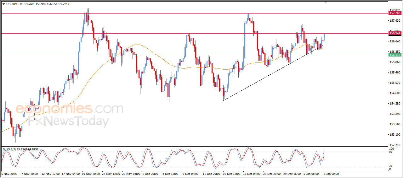 The (USDJPY) surged higher in its last intraday trading, to attack key resistance at 156.95, supported by the emergence of the positive signals from the relative strength indicators, supported by continued dynamic support that is represented by its trading above EMA50, which reinforces the stability and dominance of the main bullish trend on the short-term basis, especially with its trading alongside supportive minor trend line for this trend.