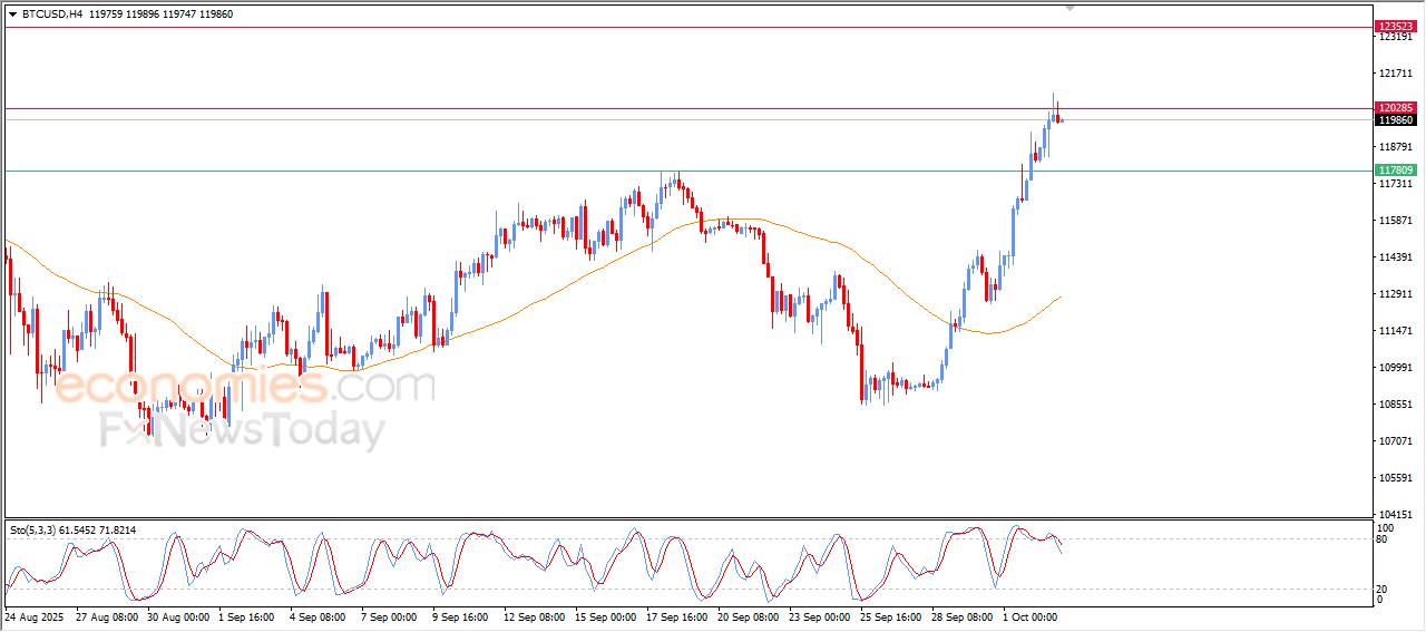 Bitcoin price (BTCUSD) declined in its latest intraday trading, after reaching our last expected target at $120,000 resistance, to gather the gains of its previous rises and attempts to gain some positive momentum that might help it to recover and breach this key psychological barrier, noticing its attempts to offload the clear overbought conditions on the relative strength indicators, especially with the emergence of the negative signals from there.