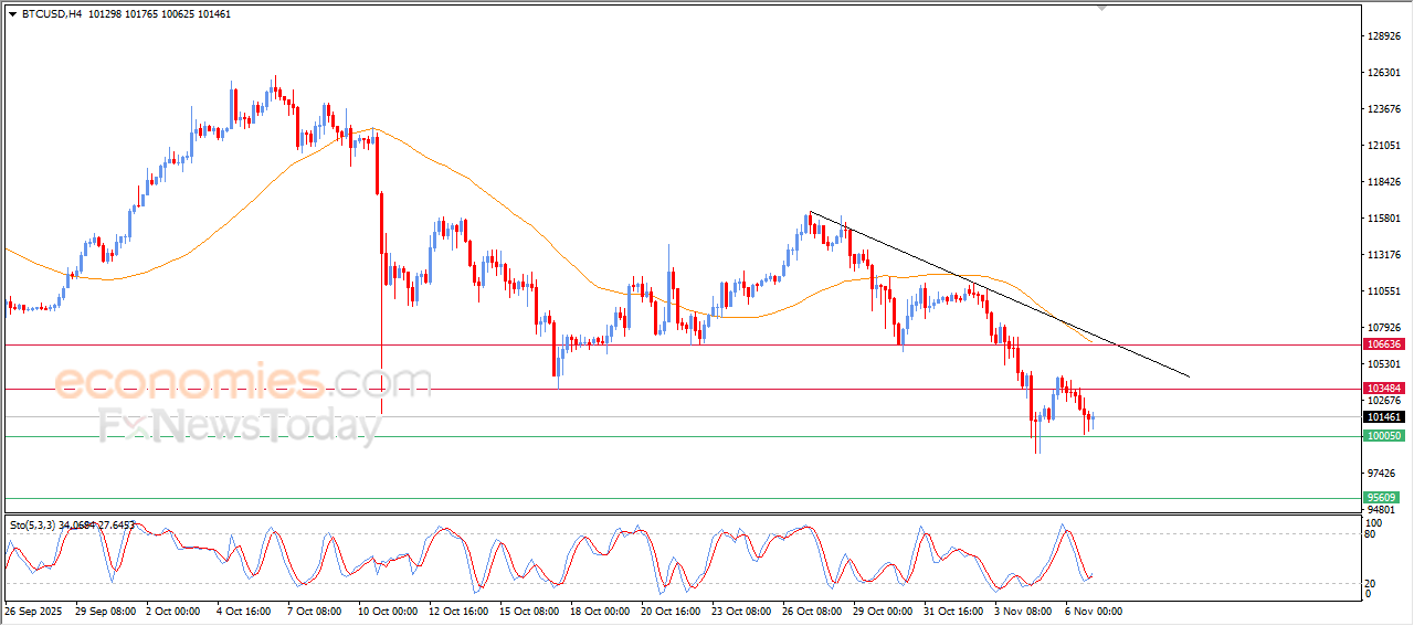 Bitcoin (BTCUSD) declined in its last trading on the intraday levels, approaching from breaking the main support level at $100,000, amid the continuation of the main bearish trend dominance on the short-term basis and the trading alongside bearish trendline that reinforces this track. Bitcoin keeps trading below EMA50, which keeps the negative pressure valid and limits the chances of a rebound.